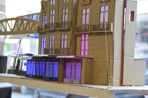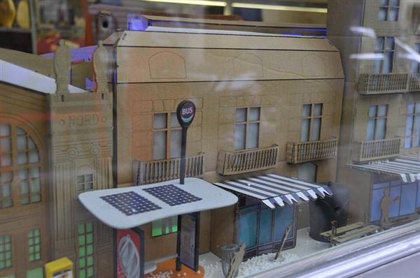 這次新櫥窗活動的重點是利用回收材料,本地制造材料,和可生物降解材料。其中一個商家就和一個設計團隊設計了一個可互動的小城市擺放在櫥窗里。他們使用店里多余的硬紙板,再生紙,觸摸感應的控制器、3D打印的裝飾物、LED燈等等。3D打印的物料方面,他們使用可生物降解的PLA材料作打印。