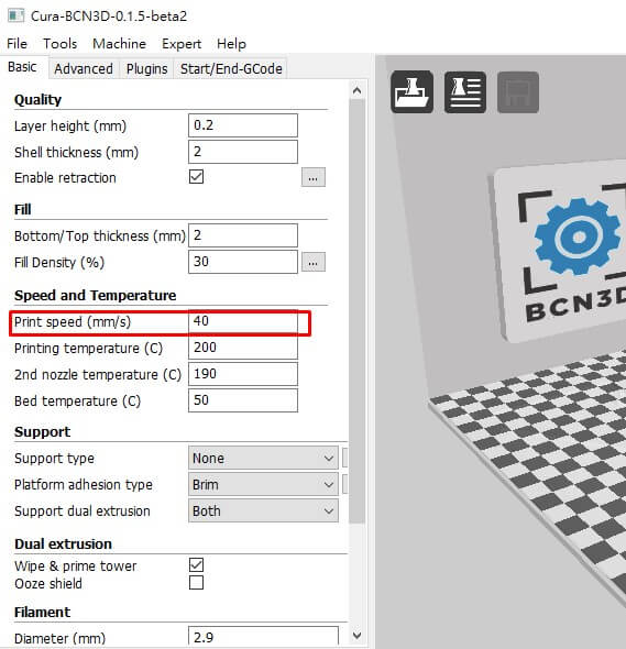 Print Speed及Travel Speed這個不用說大家都知道這兩個功能是用來調(diào)校打印噴頭的移動速度,另外,Print Speed及Travel Speed可以加快到多少很取決于模型大小及復(fù)雜性。在CURA 3D打印軟件可在這里設(shè)定: